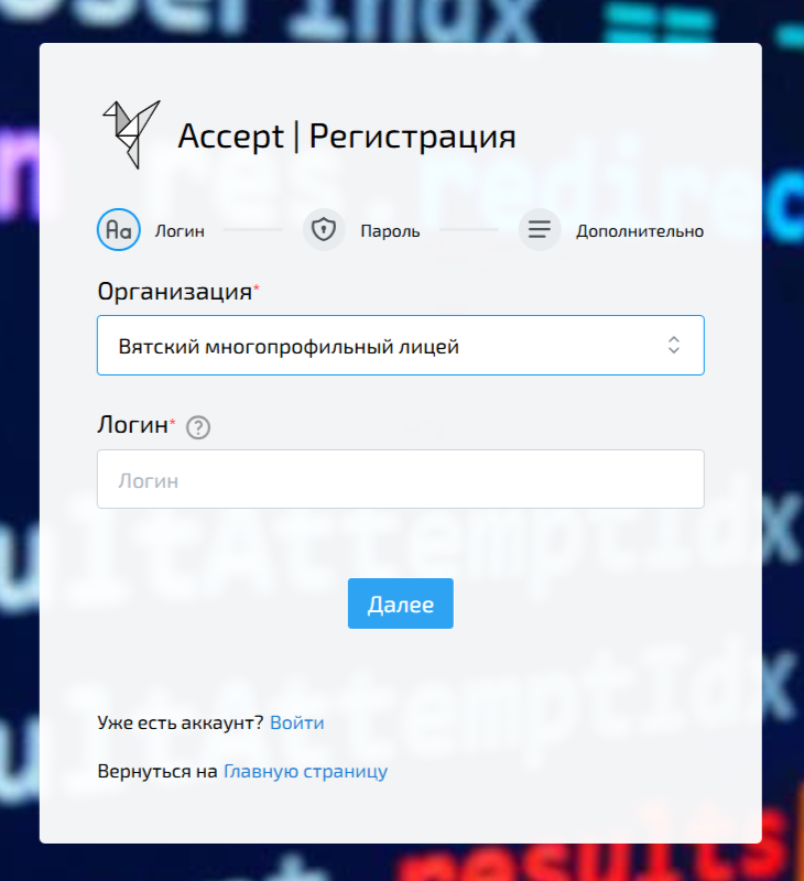 При регистрации и при входе надо выбрать площадку проведения «Вятский многопрофильный лицей»