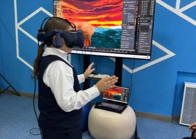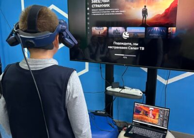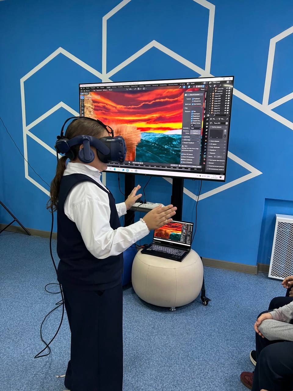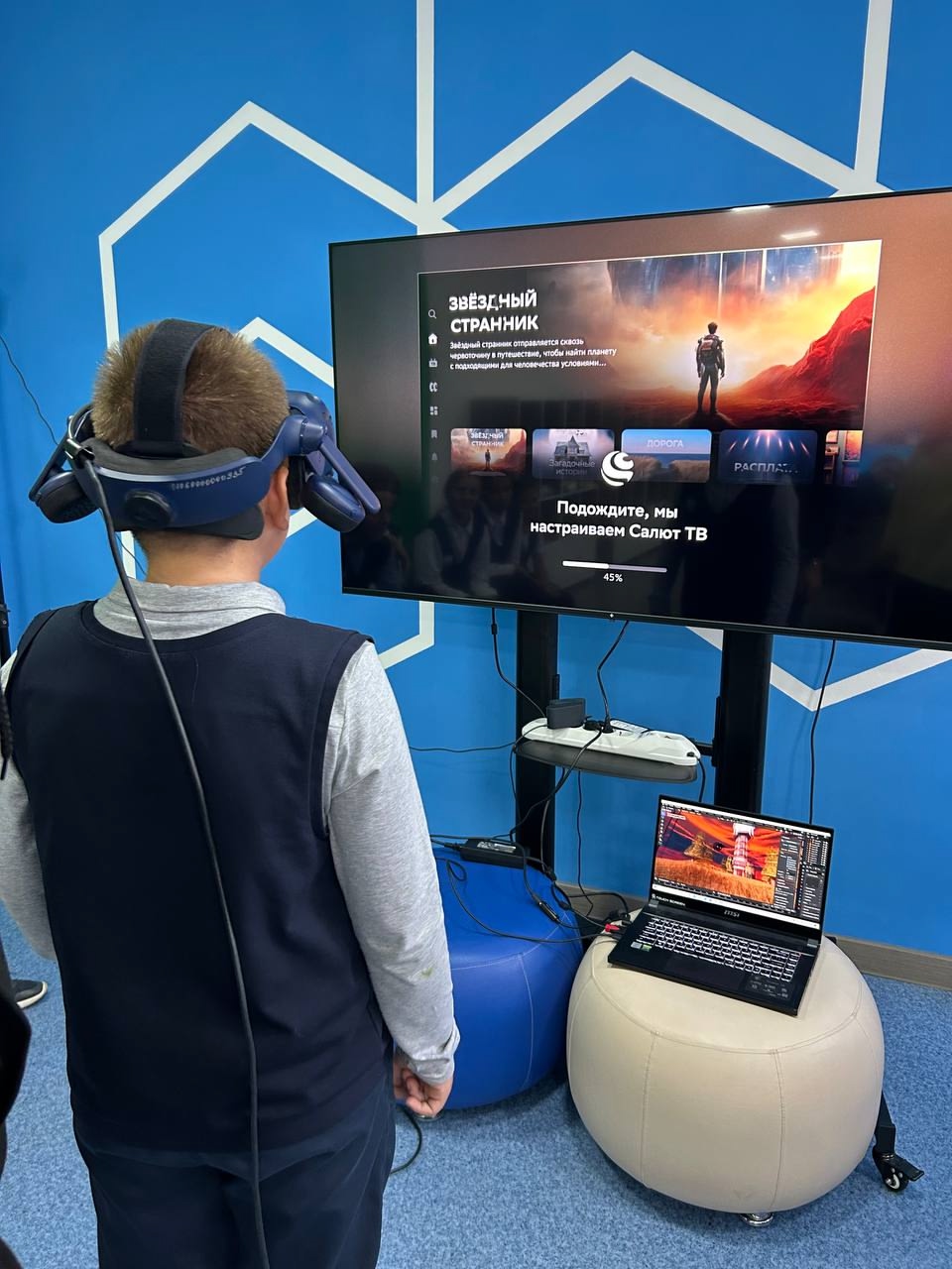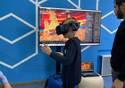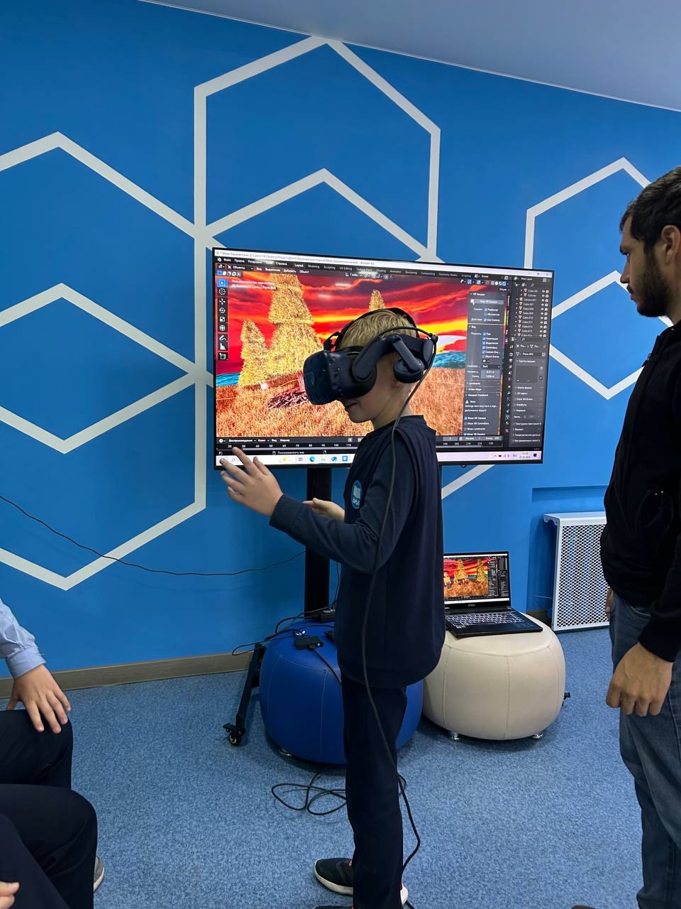 Затем ребята посетили кабинет виртуальной реальности и с помощью шлема виртуальной реальности побывали в 3D-пространствах, созданных воспитанниками Центра.