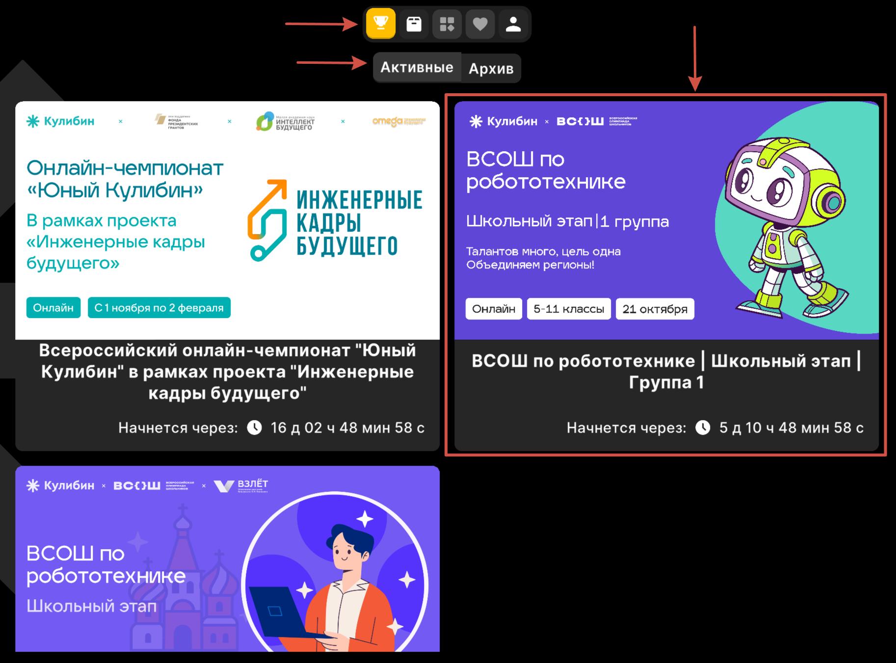 3. На вкладке «Соревнования» (иконка «Кубок» посередине вверху экрана), выбрать «Активные» и зайти в карточку «ВСОШ по робототехнике | Школьный этап Группа 1».