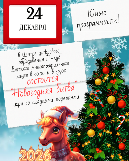 Спешим сообщить, что 24 декабря в Центре цифрового образования IT-куб Вятского многопрофильного лицея пройдет Новогодняя битва!